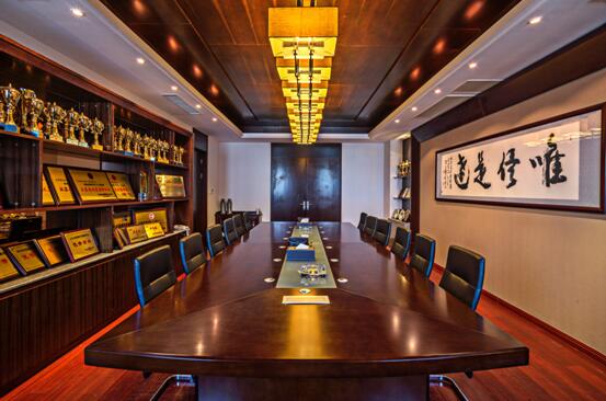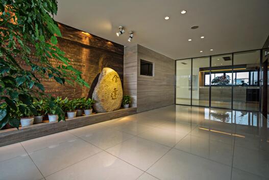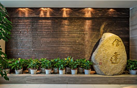 定制的背景, 以古銅色調(diào)呈現(xiàn), 企業(yè)的發(fā)展在此一 一敘述, 著名書法家徐安碧題的信達, 剛勁, 有力, 寓意深厚, 淺色石材與背景形成了色調(diào)上的對比。電梯廳造型簡潔, 構(gòu)圖適當, 透明的電動移門將前臺接待與電梯廳連在了一起, 相互映照。