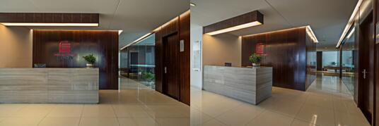 功能明確, 強調(diào)色調(diào)對比, 接待臺長度3米, 以干凈的木紋石為主要材料, 與溫暖的木紋背景形成對比, 同時與頂部的燈面造型相呼應。透明的玻璃隔斷, 通透了空間。